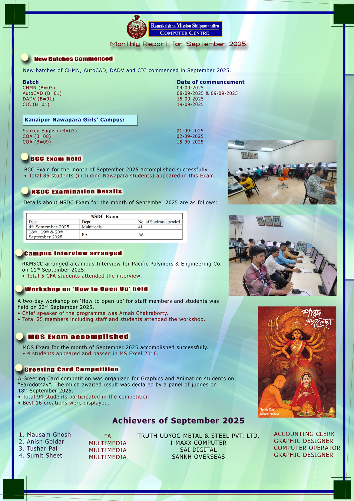 Ramakrishna Mission Shilpamandira was awarded the prestigious Kolkata Ladies Study Group Charitable Trust Award for the year 2021 in recognition of Skill Development Training Activities being conducted by the Community Training Centre